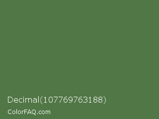 Decimal 107769763188 Color is a normal green color and the nearest color is Fern Green #4f7942. Hex code #517746 and RGB value is rgb(81,119,70). In RGB color space, this color is composed of 32% red, 47% green, 27% blue, In CMYK color space, this color is composed of 32% cyan, 0% magenta, 41% yellow , 53% black , In HSL color space, this color has a hue angle of 107° , 26% saturation and 37% lightness.