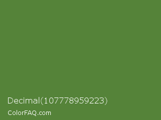 Decimal 107778959223 Color is a normal green color and the nearest color is Fern Green #4f7942. Hex code #558339 and RGB value is rgb(85,131,57). In RGB color space, this color is composed of 33% red, 51% green, 22% blue, In CMYK color space, this color is composed of 35% cyan, 0% magenta, 56% yellow , 49% black , In HSL color space, this color has a hue angle of 97° , 39% saturation and 37% lightness.