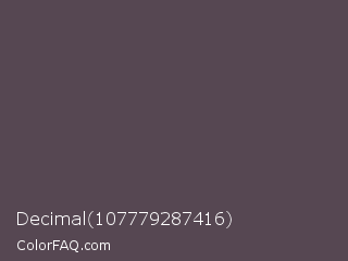 Decimal 107779287416 Color is a normal magenta color and the nearest color is Dark Liver #534b4f. Hex code #564752 and RGB value is rgb(86,71,82). In RGB color space, this color is composed of 34% red, 28% green, 32% blue, In CMYK color space, this color is composed of 0% cyan, 17% magenta, 5% yellow , 66% black , In HSL color space, this color has a hue angle of 316° , 10% saturation and 31% lightness.