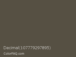 Decimal 107779297895 Color is a dark orange color and the nearest color is Fuscous Gray #54534d. Hex code #565043 and RGB value is rgb(86,80,67). In RGB color space, this color is composed of 34% red, 31% green, 26% blue, In CMYK color space, this color is composed of 0% cyan, 7% magenta, 22% yellow , 66% black , In HSL color space, this color has a hue angle of 41° , 12% saturation and 30% lightness.