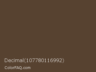 Decimal 107780116992 Color is a dark orange color and the nearest color is Millbrook #594433. Hex code #574230 and RGB value is rgb(87,66,48). In RGB color space, this color is composed of 34% red, 26% green, 19% blue, In CMYK color space, this color is composed of 0% cyan, 24% magenta, 45% yellow , 66% black , In HSL color space, this color has a hue angle of 28° , 29% saturation and 26% lightness.