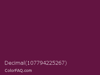 Decimal 107794225267 Color is a dark magenta color and the nearest color is Wine Berry #591d35. Hex code #631441 and RGB value is rgb(99,20,65). In RGB color space, this color is composed of 39% red, 8% green, 25% blue, In CMYK color space, this color is composed of 0% cyan, 80% magenta, 34% yellow , 61% black , In HSL color space, this color has a hue angle of 326° , 66% saturation and 23% lightness.