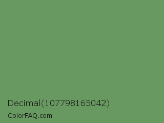 Decimal 107798165042 Color is a normal green color and the nearest color is Russian Green #679267. Hex code #689960 and RGB value is rgb(104,153,96). In RGB color space, this color is composed of 41% red, 60% green, 38% blue, In CMYK color space, this color is composed of 32% cyan, 0% magenta, 37% yellow , 40% black , In HSL color space, this color has a hue angle of 112° , 23% saturation and 49% lightness.
