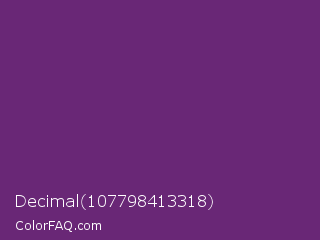 Decimal 107798413318 Color is a normal purple color and the nearest color is Midnight #702670. Hex code #692776 and RGB value is rgb(105,39,118). In RGB color space, this color is composed of 41% red, 15% green, 46% blue, In CMYK color space, this color is composed of 11% cyan, 67% magenta, 0% yellow , 54% black , In HSL color space, this color has a hue angle of 290° , 50% saturation and 31% lightness.