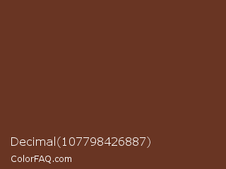 Decimal 107798426887 Color is a dark color and the nearest color is Liver Organ #6c2e1f. Hex code #693523 and RGB value is rgb(105,53,35). In RGB color space, this color is composed of 41% red, 21% green, 14% blue, In CMYK color space, this color is composed of 0% cyan, 50% magenta, 67% yellow , 59% black , In HSL color space, this color has a hue angle of 15° , 50% saturation and 27% lightness.