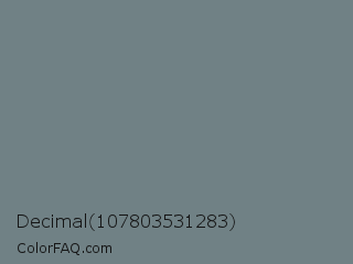 Decimal 107803531283 Color is a normal cyan color and the nearest color is Sirocco #718080. Hex code #708185 and RGB value is rgb(112,129,133). In RGB color space, this color is composed of 44% red, 51% green, 52% blue, In CMYK color space, this color is composed of 16% cyan, 3% magenta, 0% yellow , 48% black , In HSL color space, this color has a hue angle of 191° , 9% saturation and 48% lightness.