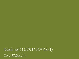 Decimal 107911320164 Color is a normal lime color and the nearest color is Crete #737829. Hex code #718130 and RGB value is rgb(113,129,48). In RGB color space, this color is composed of 44% red, 51% green, 19% blue, In CMYK color space, this color is composed of 12% cyan, 0% magenta, 63% yellow , 49% black , In HSL color space, this color has a hue angle of 72° , 46% saturation and 35% lightness.