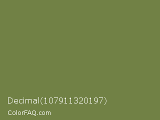 Decimal 107911320197 Color is a normal lime color and the nearest color is Go Ben #726d4e. Hex code #718145 and RGB value is rgb(113,129,69). In RGB color space, this color is composed of 44% red, 51% green, 27% blue, In CMYK color space, this color is composed of 12% cyan, 0% magenta, 47% yellow , 49% black , In HSL color space, this color has a hue angle of 76° , 30% saturation and 39% lightness.