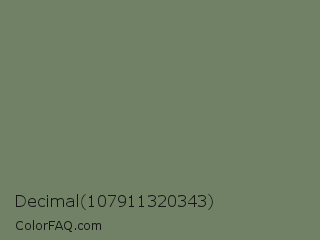 Decimal 107911320343 Color is a normal green color and the nearest color is Limed Ash #747d63. Hex code #718165 and RGB value is rgb(113,129,101). In RGB color space, this color is composed of 44% red, 51% green, 40% blue, In CMYK color space, this color is composed of 12% cyan, 0% magenta, 22% yellow , 49% black , In HSL color space, this color has a hue angle of 94° , 12% saturation and 45% lightness.