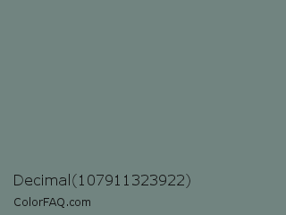 Decimal 107911323922 Color is a normal cyan color and the nearest color is Sirocco #718080. Hex code #718480 and RGB value is rgb(113,132,128). In RGB color space, this color is composed of 44% red, 52% green, 50% blue, In CMYK color space, this color is composed of 14% cyan, 0% magenta, 3% yellow , 48% black , In HSL color space, this color has a hue angle of 167° , 8% saturation and 48% lightness.