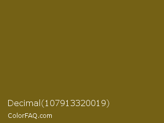 Decimal 107913320019 Color is a dark yellow color and the nearest color is Spicy Mustard #74640d. Hex code #746115 and RGB value is rgb(116,97,21). In RGB color space, this color is composed of 45% red, 38% green, 8% blue, In CMYK color space, this color is composed of 0% cyan, 16% magenta, 82% yellow , 55% black , In HSL color space, this color has a hue angle of 48° , 69% saturation and 27% lightness.