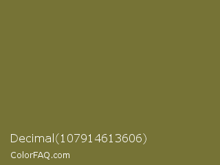 Decimal 107914613606 Color is a normal yellow color and the nearest color is Pesto #7c7631. Hex code #767336 and RGB value is rgb(118,115,54). In RGB color space, this color is composed of 46% red, 45% green, 21% blue, In CMYK color space, this color is composed of 0% cyan, 3% magenta, 54% yellow , 54% black , In HSL color space, this color has a hue angle of 57° , 37% saturation and 34% lightness.