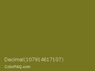 Decimal 107914617107 Color is a dark yellow color and the nearest color is Crete #737829. Hex code #767621 and RGB value is rgb(118,118,33). In RGB color space, this color is composed of 46% red, 46% green, 13% blue, In CMYK color space, this color is composed of 0% cyan, 0% magenta, 72% yellow , 54% black , In HSL color space, this color has a hue angle of 60° , 56% saturation and 30% lightness.