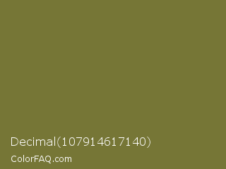 Decimal 107914617140 Color is a normal yellow color and the nearest color is Pesto #7c7631. Hex code #767636 and RGB value is rgb(118,118,54). In RGB color space, this color is composed of 46% red, 46% green, 21% blue, In CMYK color space, this color is composed of 0% cyan, 0% magenta, 54% yellow , 54% black , In HSL color space, this color has a hue angle of 60° , 37% saturation and 34% lightness.