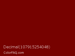 Decimal 107915254048 Color is a dark red color and the nearest color is Japanese Maple #780109. Hex code #770200 and RGB value is rgb(119,2,0). In RGB color space, this color is composed of 47% red, 1% green, 0% blue, In CMYK color space, this color is composed of 0% cyan, 98% magenta, 100% yellow , 53% black , In HSL color space, this color has a hue angle of 1° , 100% saturation and 23% lightness.