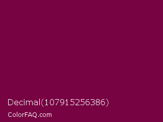 Decimal 107915256386 Color is a dark magenta color and the nearest color is Siren #7a013a. Hex code #770342 and RGB value is rgb(119,3,66). In RGB color space, this color is composed of 47% red, 1% green, 26% blue, In CMYK color space, this color is composed of 0% cyan, 97% magenta, 45% yellow , 53% black , In HSL color space, this color has a hue angle of 327° , 95% saturation and 24% lightness.