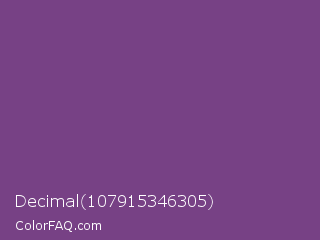 Decimal 107915346305 Color is a normal purple color and the nearest color is Maximum Purple #733380. Hex code #774185 and RGB value is rgb(119,65,133). In RGB color space, this color is composed of 47% red, 25% green, 52% blue, In CMYK color space, this color is composed of 11% cyan, 51% magenta, 0% yellow , 48% black , In HSL color space, this color has a hue angle of 288° , 34% saturation and 39% lightness.