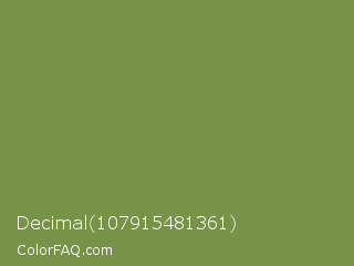 Decimal 107915481361 Color is a normal green color and the nearest color is Palm Leaf #6f9940. Hex code #779347 and RGB value is rgb(119,147,71). In RGB color space, this color is composed of 47% red, 58% green, 28% blue, In CMYK color space, this color is composed of 19% cyan, 0% magenta, 52% yellow , 42% black , In HSL color space, this color has a hue angle of 82° , 35% saturation and 43% lightness.
