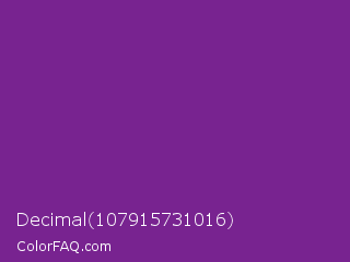 Decimal 107915731016 Color is a normal purple color and the nearest color is Seance #731e8f. Hex code #782390 and RGB value is rgb(120,35,144). In RGB color space, this color is composed of 47% red, 14% green, 56% blue, In CMYK color space, this color is composed of 17% cyan, 76% magenta, 0% yellow , 44% black , In HSL color space, this color has a hue angle of 287° , 61% saturation and 35% lightness.
