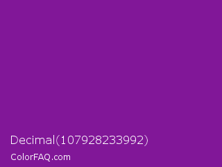 Decimal 107928233992 Color is a normal purple color and the nearest color is Seance #731e8f. Hex code #811798 and RGB value is rgb(129,23,152). In RGB color space, this color is composed of 51% red, 9% green, 60% blue, In CMYK color space, this color is composed of 15% cyan, 85% magenta, 0% yellow , 40% black , In HSL color space, this color has a hue angle of 289° , 74% saturation and 34% lightness.
