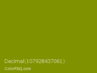Decimal 107928437061 Color is a dark yellow color and the nearest color is Olive #808000. Hex code #819201 and RGB value is rgb(129,146,1). In RGB color space, this color is composed of 51% red, 57% green, 0% blue, In CMYK color space, this color is composed of 12% cyan, 0% magenta, 99% yellow , 43% black , In HSL color space, this color has a hue angle of 67° , 99% saturation and 29% lightness.