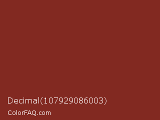 Decimal 107929086003 Color is a normal red color and the nearest color is Red Robin #80341f. Hex code #822921 and RGB value is rgb(130,41,33). In RGB color space, this color is composed of 51% red, 16% green, 13% blue, In CMYK color space, this color is composed of 0% cyan, 68% magenta, 75% yellow , 49% black , In HSL color space, this color has a hue angle of 5° , 60% saturation and 32% lightness.
