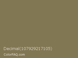 Decimal 107929217105 Color is a normal yellow color and the nearest color is Gold Fusion #85754e. Hex code #827753 and RGB value is rgb(130,119,83). In RGB color space, this color is composed of 51% red, 47% green, 33% blue, In CMYK color space, this color is composed of 0% cyan, 8% magenta, 36% yellow , 49% black , In HSL color space, this color has a hue angle of 46° , 22% saturation and 42% lightness.