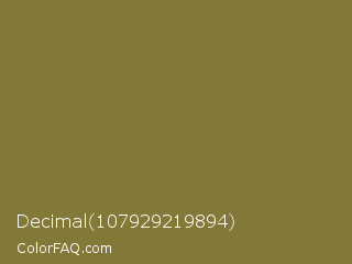 Decimal 107929219894 Color is a normal yellow color and the nearest color is Old Moss Green #867e36. Hex code #827938 and RGB value is rgb(130,121,56). In RGB color space, this color is composed of 51% red, 47% green, 22% blue, In CMYK color space, this color is composed of 0% cyan, 7% magenta, 57% yellow , 49% black , In HSL color space, this color has a hue angle of 53° , 40% saturation and 36% lightness.