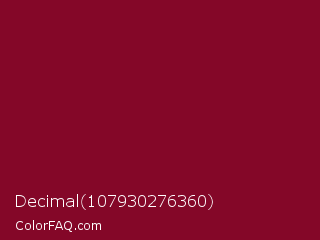 Decimal 107930276360 Color is a dark rose color and the nearest color is Monarch #8b0723. Hex code #840728 and RGB value is rgb(132,7,40). In RGB color space, this color is composed of 52% red, 3% green, 16% blue, In CMYK color space, this color is composed of 0% cyan, 95% magenta, 70% yellow , 48% black , In HSL color space, this color has a hue angle of 344° , 90% saturation and 27% lightness.