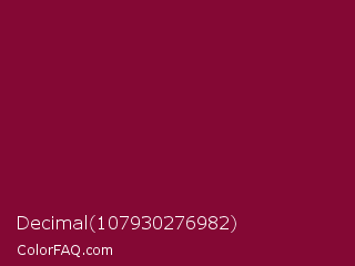 Decimal 107930276982 Color is a dark rose color and the nearest color is Siren #7a013a. Hex code #840834 and RGB value is rgb(132,8,52). In RGB color space, this color is composed of 52% red, 3% green, 20% blue, In CMYK color space, this color is composed of 0% cyan, 94% magenta, 61% yellow , 48% black , In HSL color space, this color has a hue angle of 339° , 89% saturation and 27% lightness.