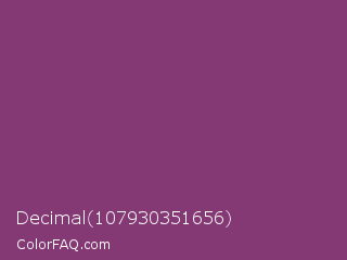 Decimal 107930351656 Color is a normal magenta color and the nearest color is Razzmic Berry Crayola #843179. Hex code #843874 and RGB value is rgb(132,56,116). In RGB color space, this color is composed of 52% red, 22% green, 45% blue, In CMYK color space, this color is composed of 0% cyan, 58% magenta, 12% yellow , 48% black , In HSL color space, this color has a hue angle of 313° , 40% saturation and 37% lightness.
