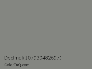 Decimal 107930482697 Color is a normal green color and the nearest color is Battleship Grey #848482. Hex code #848681 and RGB value is rgb(132,134,129). In RGB color space, this color is composed of 52% red, 53% green, 51% blue, In CMYK color space, this color is composed of 1% cyan, 0% magenta, 4% yellow , 47% black , In HSL color space, this color has a hue angle of 84° , 2% saturation and 52% lightness.
