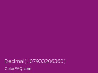 Decimal 107933206360 Color is a normal magenta color and the nearest color is Patriarch #800080. Hex code #881476 and RGB value is rgb(136,20,118). In RGB color space, this color is composed of 53% red, 8% green, 46% blue, In CMYK color space, this color is composed of 0% cyan, 85% magenta, 13% yellow , 47% black , In HSL color space, this color has a hue angle of 309° , 74% saturation and 31% lightness.