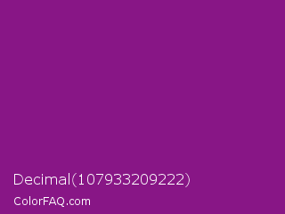 Decimal 107933209222 Color is a normal magenta color and the nearest color is Mardi Gras #880085. Hex code #881686 and RGB value is rgb(136,22,134). In RGB color space, this color is composed of 53% red, 9% green, 53% blue, In CMYK color space, this color is composed of 0% cyan, 84% magenta, 1% yellow , 47% black , In HSL color space, this color has a hue angle of 301° , 72% saturation and 31% lightness.
