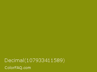 Decimal 107933411589 Color is a dark yellow color and the nearest color is Olive #808000. Hex code #889209 and RGB value is rgb(136,146,9). In RGB color space, this color is composed of 53% red, 57% green, 4% blue, In CMYK color space, this color is composed of 7% cyan, 0% magenta, 94% yellow , 43% black , In HSL color space, this color has a hue angle of 64° , 88% saturation and 30% lightness.