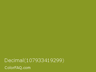 Decimal 107933419299 Color is a normal yellow color and the nearest color is Wasabi #788a25. Hex code #889923 and RGB value is rgb(136,153,35). In RGB color space, this color is composed of 53% red, 60% green, 14% blue, In CMYK color space, this color is composed of 11% cyan, 0% magenta, 77% yellow , 40% black , In HSL color space, this color has a hue angle of 69° , 63% saturation and 37% lightness.