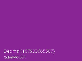 Decimal 107933665587 Color is a normal magenta color and the nearest color is Vivid Violet #803790. Hex code #892695 and RGB value is rgb(137,38,149). In RGB color space, this color is composed of 54% red, 15% green, 58% blue, In CMYK color space, this color is composed of 8% cyan, 74% magenta, 0% yellow , 42% black , In HSL color space, this color has a hue angle of 294° , 59% saturation and 37% lightness.