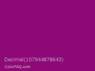 Decimal 107944878643 Color is a dark magenta color and the nearest color is Mardi Gras #880085. Hex code #900979 and RGB value is rgb(144,9,121). In RGB color space, this color is composed of 56% red, 4% green, 47% blue, In CMYK color space, this color is composed of 0% cyan, 94% magenta, 16% yellow , 44% black , In HSL color space, this color has a hue angle of 310° , 88% saturation and 30% lightness.
