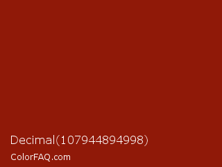 Decimal 107944894998 Color is a dark red color and the nearest color is Totem Pole #991b07. Hex code #901908 and RGB value is rgb(144,25,8). In RGB color space, this color is composed of 56% red, 10% green, 3% blue, In CMYK color space, this color is composed of 0% cyan, 83% magenta, 94% yellow , 44% black , In HSL color space, this color has a hue angle of 8° , 89% saturation and 30% lightness.
