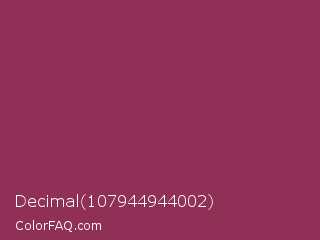 Decimal 107944944002 Color is a normal rose color and the nearest color is Camelot #893456. Hex code #903056 and RGB value is rgb(144,48,86). In RGB color space, this color is composed of 56% red, 19% green, 34% blue, In CMYK color space, this color is composed of 0% cyan, 67% magenta, 40% yellow , 44% black , In HSL color space, this color has a hue angle of 336° , 50% saturation and 38% lightness.