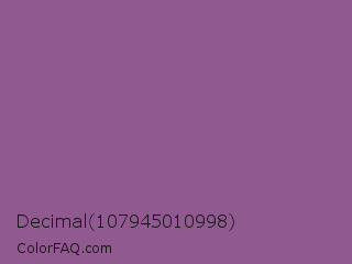 Decimal 107945010998 Color is a normal magenta color and the nearest color is French Lilac #86608e. Hex code #905990 and RGB value is rgb(144,89,144). In RGB color space, this color is composed of 56% red, 35% green, 56% blue, In CMYK color space, this color is composed of 0% cyan, 38% magenta, 0% yellow , 44% black , In HSL color space, this color has a hue angle of 300° , 24% saturation and 46% lightness.