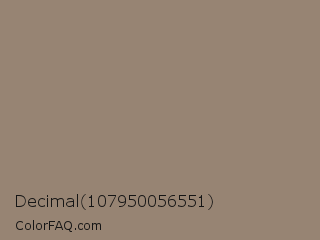 Decimal 107950056551 Color is a normal orange color and the nearest color is Arrowtown #948771. Hex code #978473 and RGB value is rgb(151,132,115). In RGB color space, this color is composed of 59% red, 52% green, 45% blue, In CMYK color space, this color is composed of 0% cyan, 13% magenta, 24% yellow , 41% black , In HSL color space, this color has a hue angle of 28° , 15% saturation and 52% lightness.