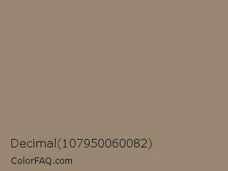 Decimal 107950060082 Color is a normal orange color and the nearest color is Arrowtown #948771. Hex code #978770 and RGB value is rgb(151,135,112). In RGB color space, this color is composed of 59% red, 53% green, 44% blue, In CMYK color space, this color is composed of 0% cyan, 11% magenta, 26% yellow , 41% black , In HSL color space, this color has a hue angle of 35° , 16% saturation and 52% lightness.