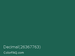 Decimal 26367763 Color is a dark cyan color and the nearest color is Green Pea #1d6142. Hex code #1d6251 and RGB value is rgb(29,98,81). In RGB color space, this color is composed of 11% red, 38% green, 32% blue, In CMYK color space, this color is composed of 70% cyan, 0% magenta, 17% yellow , 62% black , In HSL color space, this color has a hue angle of 165° , 54% saturation and 25% lightness.