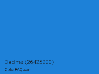 Decimal 26425220 Color is a normal blue color and the nearest color is Bright Navy Blue #1974d2. Hex code #1d81d8 and RGB value is rgb(29,129,216). In RGB color space, this color is composed of 11% red, 51% green, 85% blue, In CMYK color space, this color is composed of 87% cyan, 40% magenta, 0% yellow , 15% black , In HSL color space, this color has a hue angle of 208° , 76% saturation and 48% lightness.