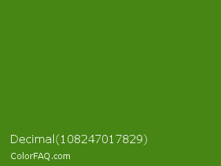 Decimal 108247017829 Color is a dark green color and the nearest color is La Palma #368716. Hex code #478515 and RGB value is rgb(71,133,21). In RGB color space, this color is composed of 28% red, 52% green, 8% blue, In CMYK color space, this color is composed of 47% cyan, 0% magenta, 84% yellow , 48% black , In HSL color space, this color has a hue angle of 93° , 73% saturation and 30% lightness.