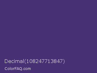 Decimal 108247713847 Color is a normal violet color and the nearest color is Minsk #3f307f. Hex code #483075 and RGB value is rgb(72,48,117). In RGB color space, this color is composed of 28% red, 19% green, 46% blue, In CMYK color space, this color is composed of 38% cyan, 59% magenta, 0% yellow , 54% black , In HSL color space, this color has a hue angle of 261° , 42% saturation and 32% lightness.