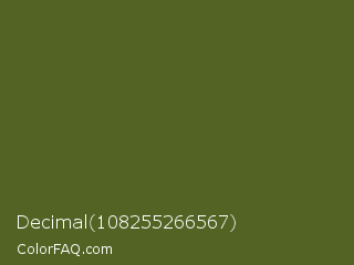 Decimal 108255266567 Color is a dark lime color and the nearest color is Dark Moss Green #4a5d23. Hex code #536323 and RGB value is rgb(83,99,35). In RGB color space, this color is composed of 33% red, 39% green, 14% blue, In CMYK color space, this color is composed of 16% cyan, 0% magenta, 65% yellow , 61% black , In HSL color space, this color has a hue angle of 75° , 48% saturation and 26% lightness.