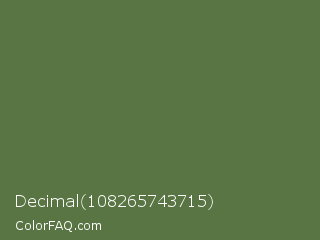 Decimal 108265743715 Color is a normal green color and the nearest color is Dingley #5d7747. Hex code #597543 and RGB value is rgb(89,117,67). In RGB color space, this color is composed of 35% red, 46% green, 26% blue, In CMYK color space, this color is composed of 24% cyan, 0% magenta, 43% yellow , 54% black , In HSL color space, this color has a hue angle of 94° , 27% saturation and 36% lightness.