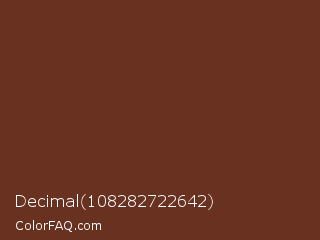 Decimal 108282722642 Color is a dark color and the nearest color is Liver Organ #6c2e1f. Hex code #693220 and RGB value is rgb(105,50,32). In RGB color space, this color is composed of 41% red, 20% green, 13% blue, In CMYK color space, this color is composed of 0% cyan, 52% magenta, 70% yellow , 59% black , In HSL color space, this color has a hue angle of 15° , 53% saturation and 27% lightness.